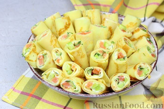 - Блины с сёмгой и огурцом — тонкие блинчики с начинкой из нежной красной рыбы и свежих огурцов, подаются в виде симпатичных рулетиков. Это не только выглядит привлекательно, но и дарит великолепное сочетание вкусов!
