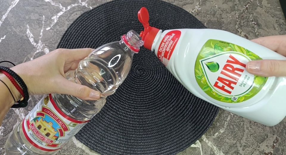 Для приготовления смеси нужно взять 1 стакан воды, 1/2 стакана уксуса и 1 чайную ложку моющего средства. Размешайте в бутылке с распылителем и используйте для уборки разных поверхностей.