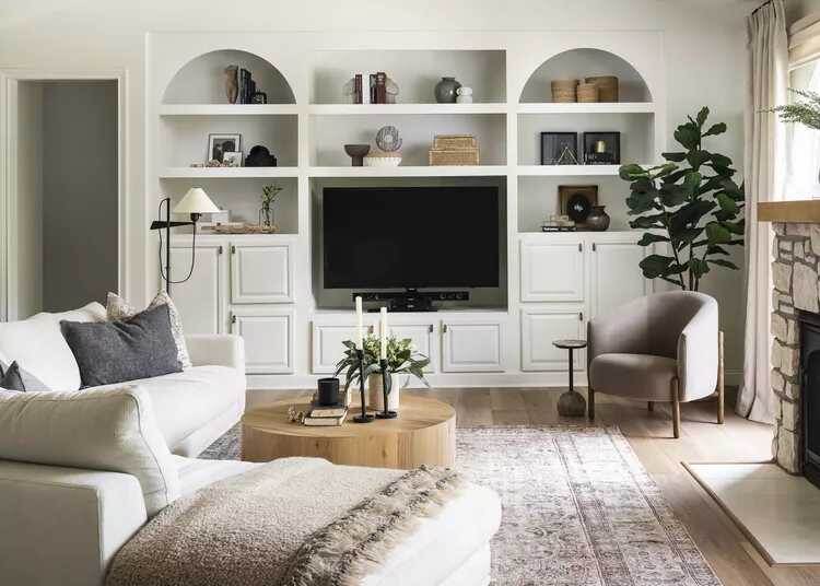 - Избыток книг: Хотя книги могут становиться декоративным элементом, их чрезмерное количество создает ощущение беспорядка. Лучше оставить одну-две книги для создания композиции, на которую можно добавить еще несколько небольших аксессуаров — например, вазу или подсвечник.