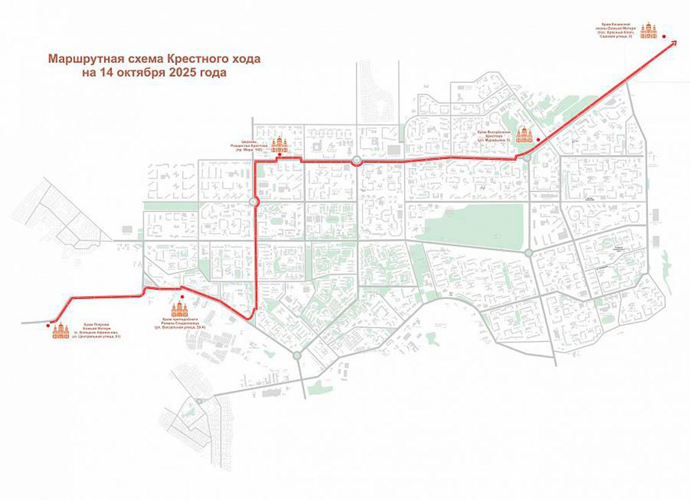 Участники крестного хода пройдут по маршруту, включающему пять храмов: от храма Покрова Божией Матери в селе Большое Афанасово через храм Романа Сладкопевца на улице Вокзальной, храм Рождества Христова на проспекте Мира, храм Воскресения Христова на улице Мурадьяна до храма Казанской иконы Божией Матери в поселке Красный Ключ.