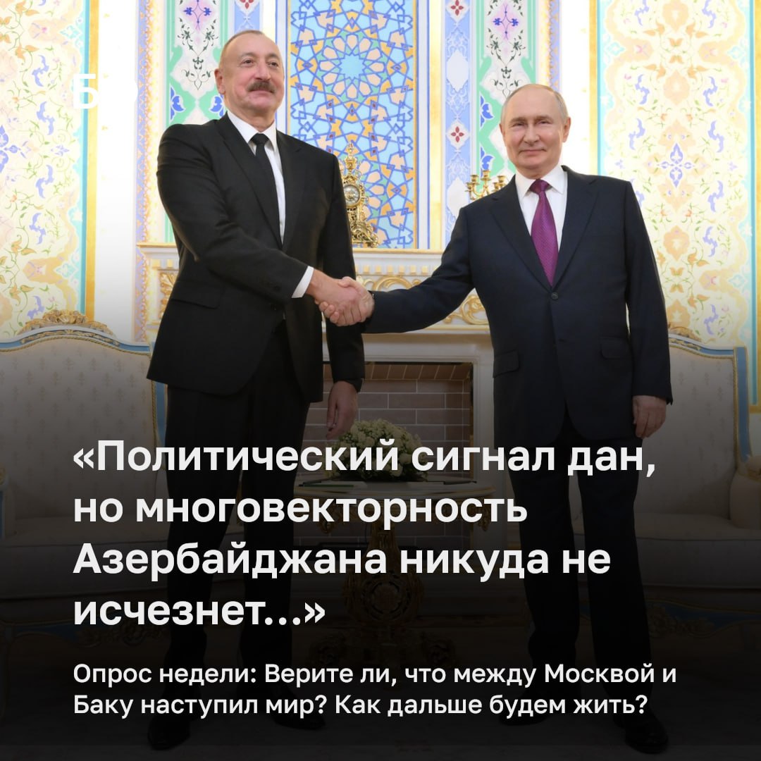 Россия и Азербайджан после периода напряженных отношений, кажется, помирились. На неделе Ильхам Алиев поздравил Владимира Путина с днем рождения, а затем президенты провели встречу. По словам Путина, страны столкнулись с «кризисом эмоций». Как считаете, помирились ли Москва и Баку? А что помогло снять напряжение? Какой фактор повлиял? Как дальше будут развиваться наши отношения? Не будет ли нового обострения? И какой вывод нужно сделать из этого эпизода? БИЗНЕС Online отвечают Евгений Минченко, Алексей Мухин, Борис Межуев и другие.
