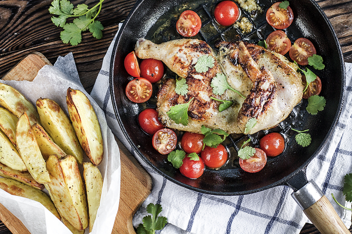 Шаг 2: Помидоры черри нарежьте пополам, а кинзу мелко порубите. Добавьте черри и немного кинзы на сковороду с цыпленком и жарьте еще 1-2 минуты. На сервировочную тарелку распределите приготовленный картофель и цыпленка. Посыпьте свежей кинзой для украшения. Подавайте немедленно, чтобы насладиться всеми вкусами!