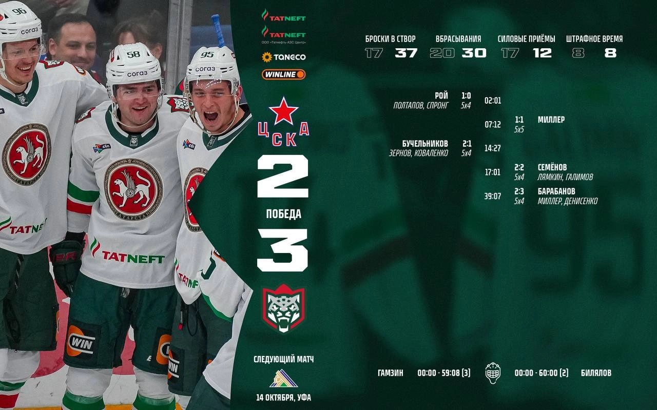 Хоккеисты казанского «Ак Барса» одержали волевую победу над московским ЦСКА со счетом 3:2, продлив свою победную серию до четырех матчей подряд.