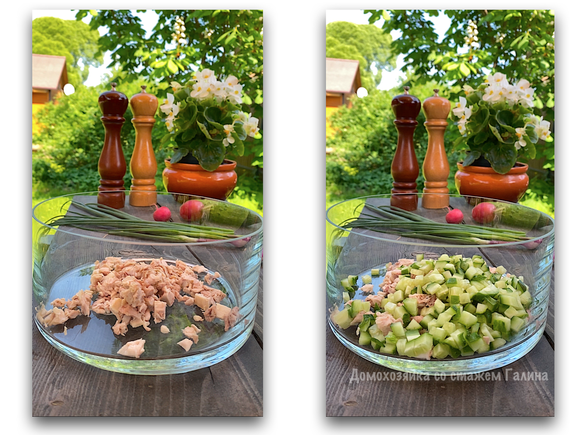 - Подготовить ингредиенты: нарезать вареную курицу (или использовать колбасу), свежий огурец, редис, укроп и зеленый лук. По желанию можно добавить вареный картофель для более питательной версии.