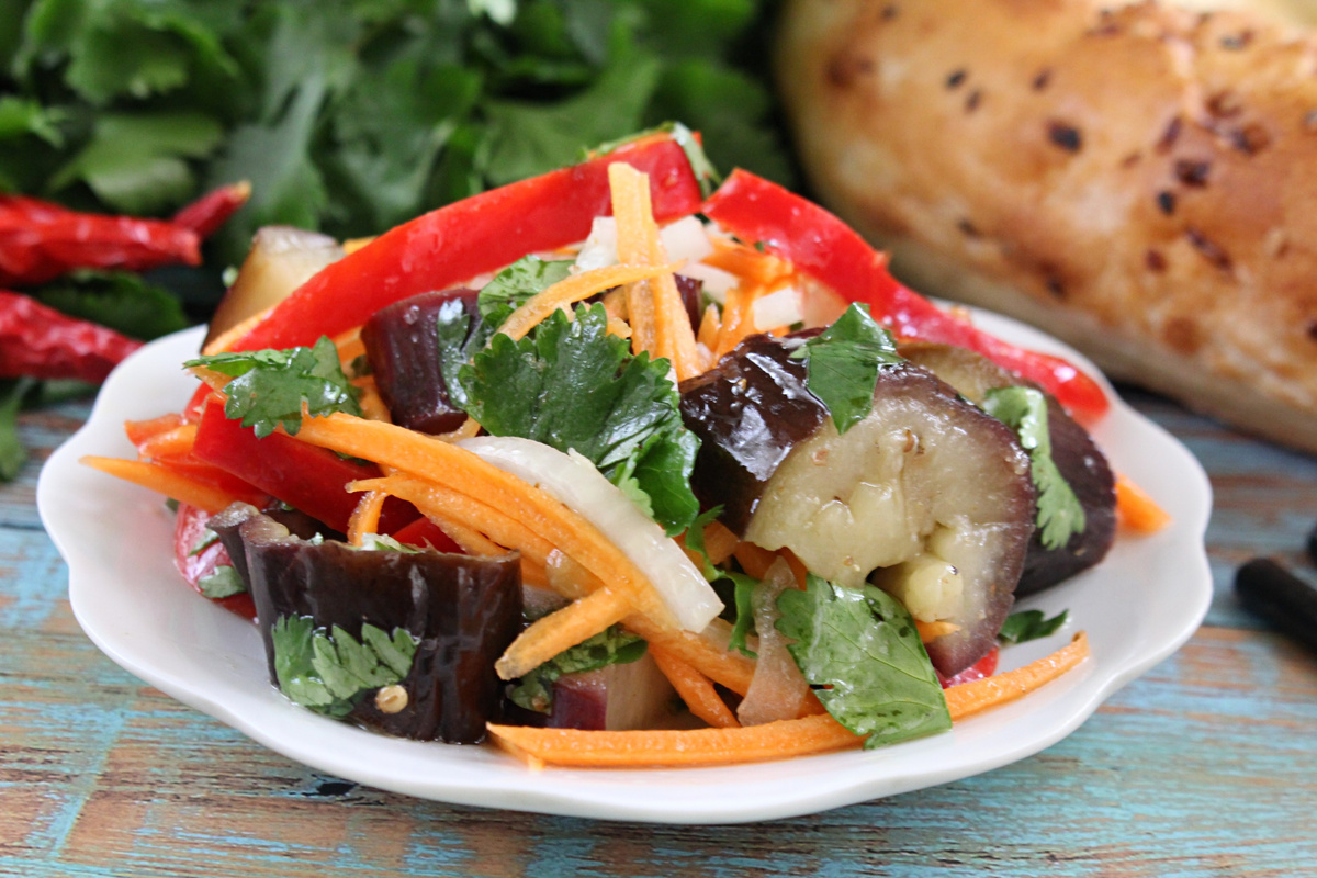 Когда баклажаны остынут, их нарезают кружочками или полукружьями, и добавляют в контейнер с остальными овощами. Далее в салат добавляют сахар, соль и молотый кориандр по вкусу. На завершающем этапе влить растительное масло и уксус, тщательно перемешать и попробовать. Салат следует убрать в холодильник на 12 часов для настояния, но попробовать его можно уже через 2-3 часа.