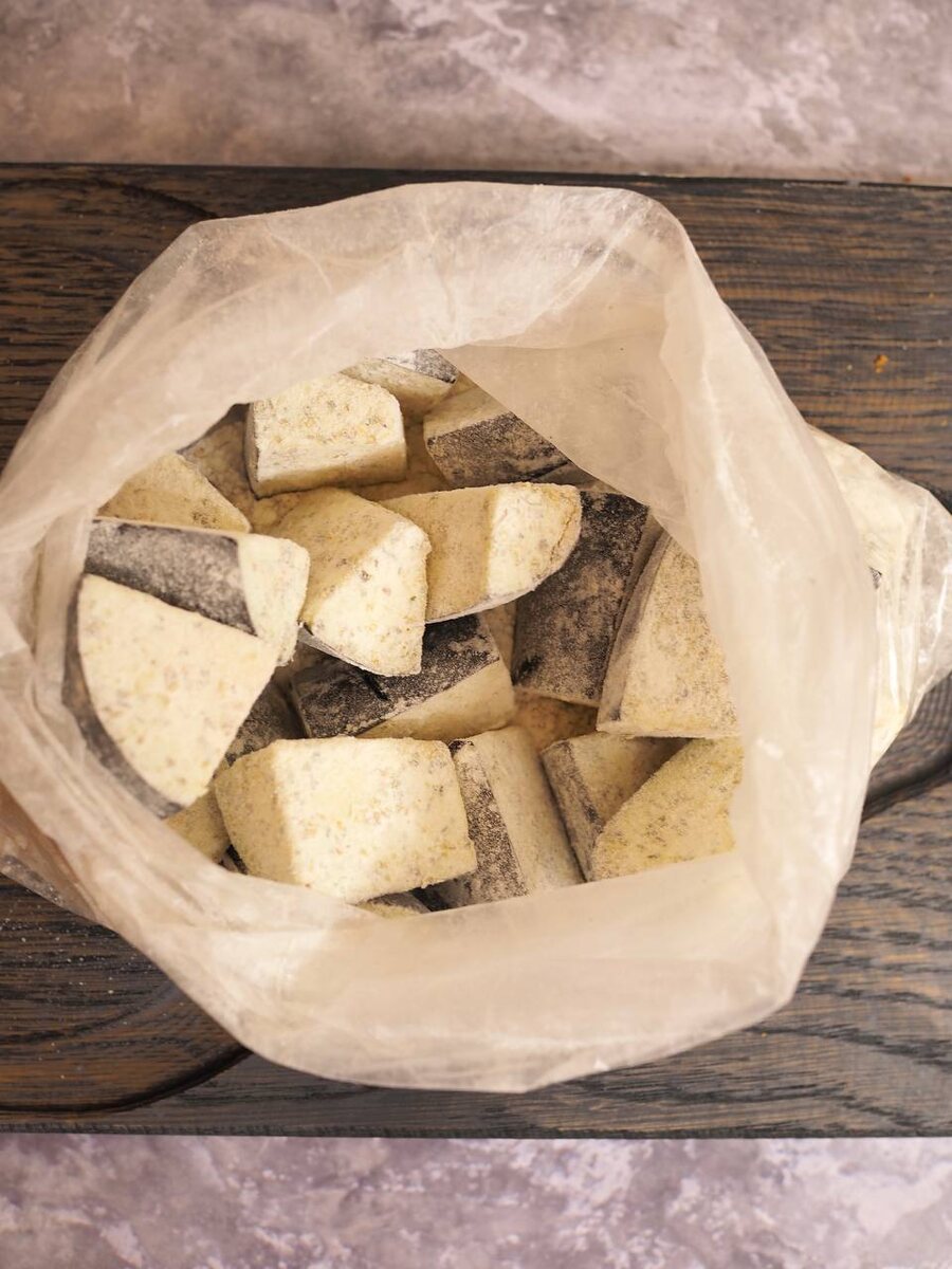 - Сначала баклажаны нарезать кубиками и тщательно обвалять в кукурузном крахмале. Это обеспечит им аппетитную хрустящую корочку.