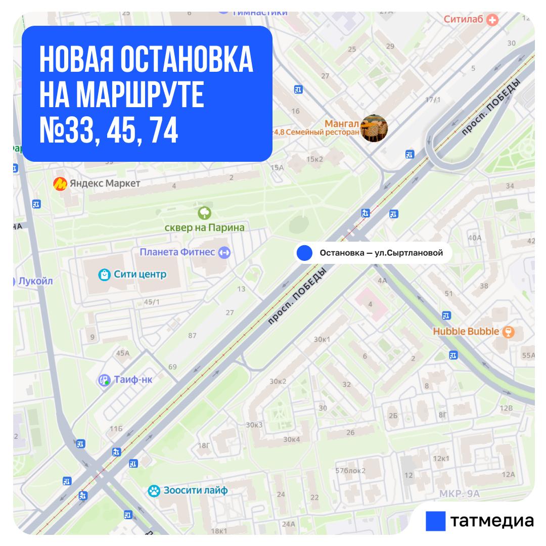 С 18 октября на маршрутах появится остановка на улицеСыртлановой по Проспекту Победы в направлении улицы Хусаина Мавлютова.