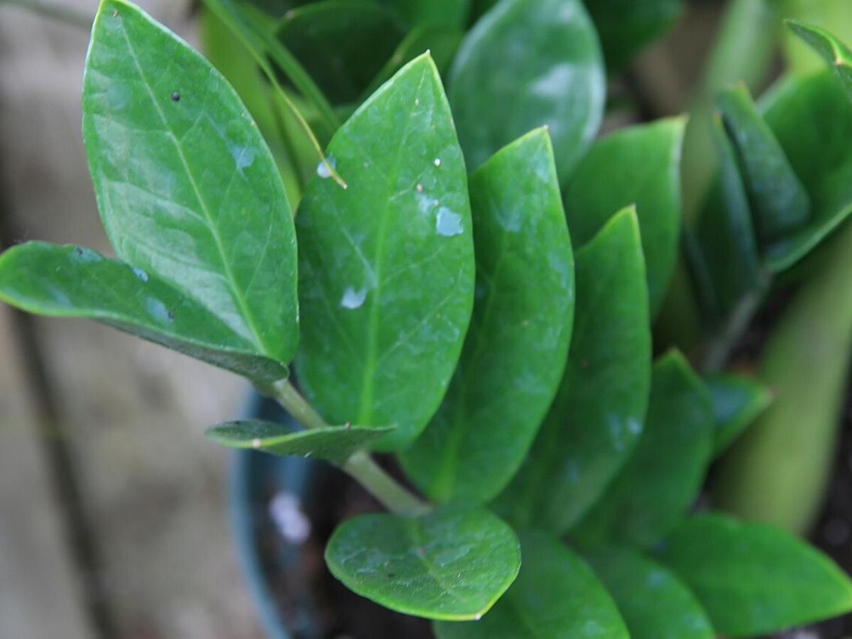 Такой полив вызывает стремительный рост новых побегов. Листья становятся плотными, насыщенного тёмно-зелёного оттенка и блестят на солнце. По наблюдениям, в течение года замиокулькас способен сформировать до 20 новых отростков!