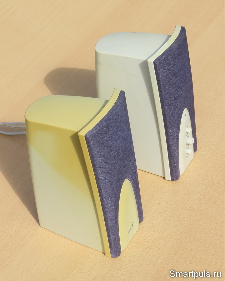 Самый яркий пример — это две компьютерные колонки, одна из которых прошла процедуру отбеливания, а другая осталась в своем прежнем виде. Как видно на фотографии, пожелтение явно заметно на тех участках, которые подвергались воздействию света.