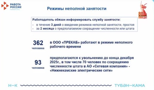 В ООО «Прекаб» до конца года уволят 93 работника. Предприятие сейчас работает в режиме неполной занятости. В «Нижнекамских электрических сетях» под сокращение попадут 70 сотрудников.