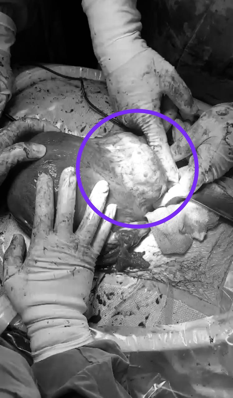 «Узел находился практически на уровне шейки матки, что является сложностью при удалении узла. В процессе кесарева сечения нам стало понятно, что узел находится на уровне крестцово-мышечных связок и расположен на длинной ножке, что позволило удалить узел. И удивительная особенность – миома росла не в самой матке, а рядом – под серозной оболочкой», – объяснил акушер-гинеколог Ахмад Халед Аль-Аккуми.