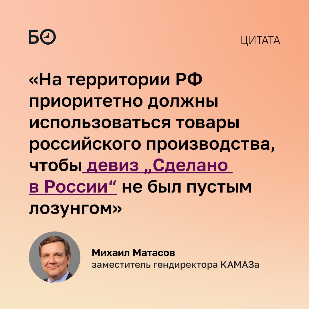 Российские компании должны отдавать приоритет отечественному производству, чтобы девиз «Сделано в России» имел реальное значение, а не был пустым лозунгом. Об этом заявил топ-менеджер КАМАЗа Михаил Матасов на совещании по производству авто для такси.