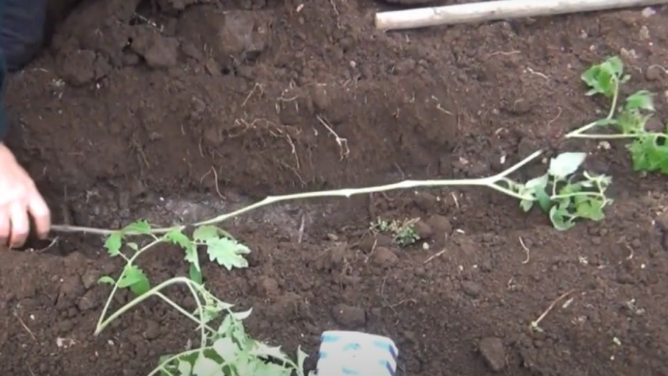 После этого рассаду помещают в бороздки, предварительно удаляя нижние листья, оставляя не менее пяти листочков и макушку. Растение засыпают землей до уровня 15 см и поливают водой. Также важно установить подпорки — это поможет поддержать растение в первые дни роста.