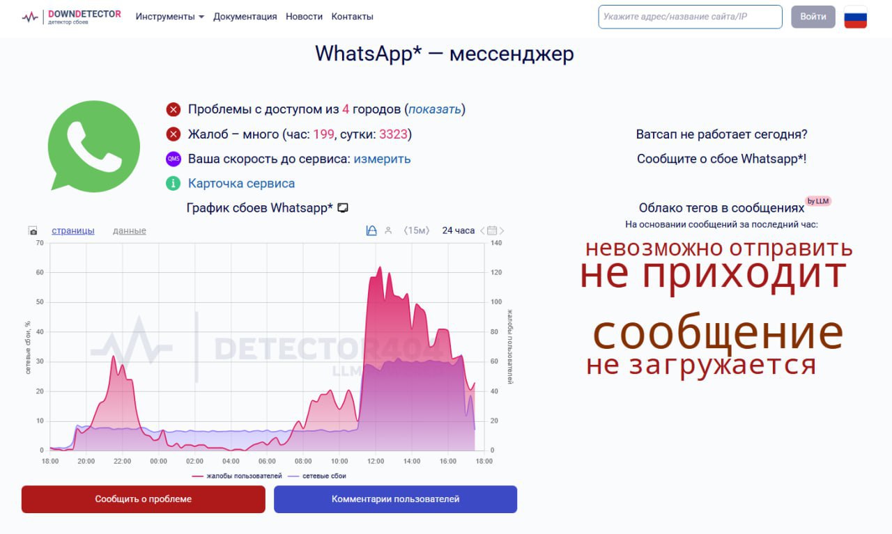 В работе WhatsApp* и Telegram произошел сбой. Татарстан вошел в топ-10 регионов по числу жалоб, следует из данных сервиса «Сбой.РФ».