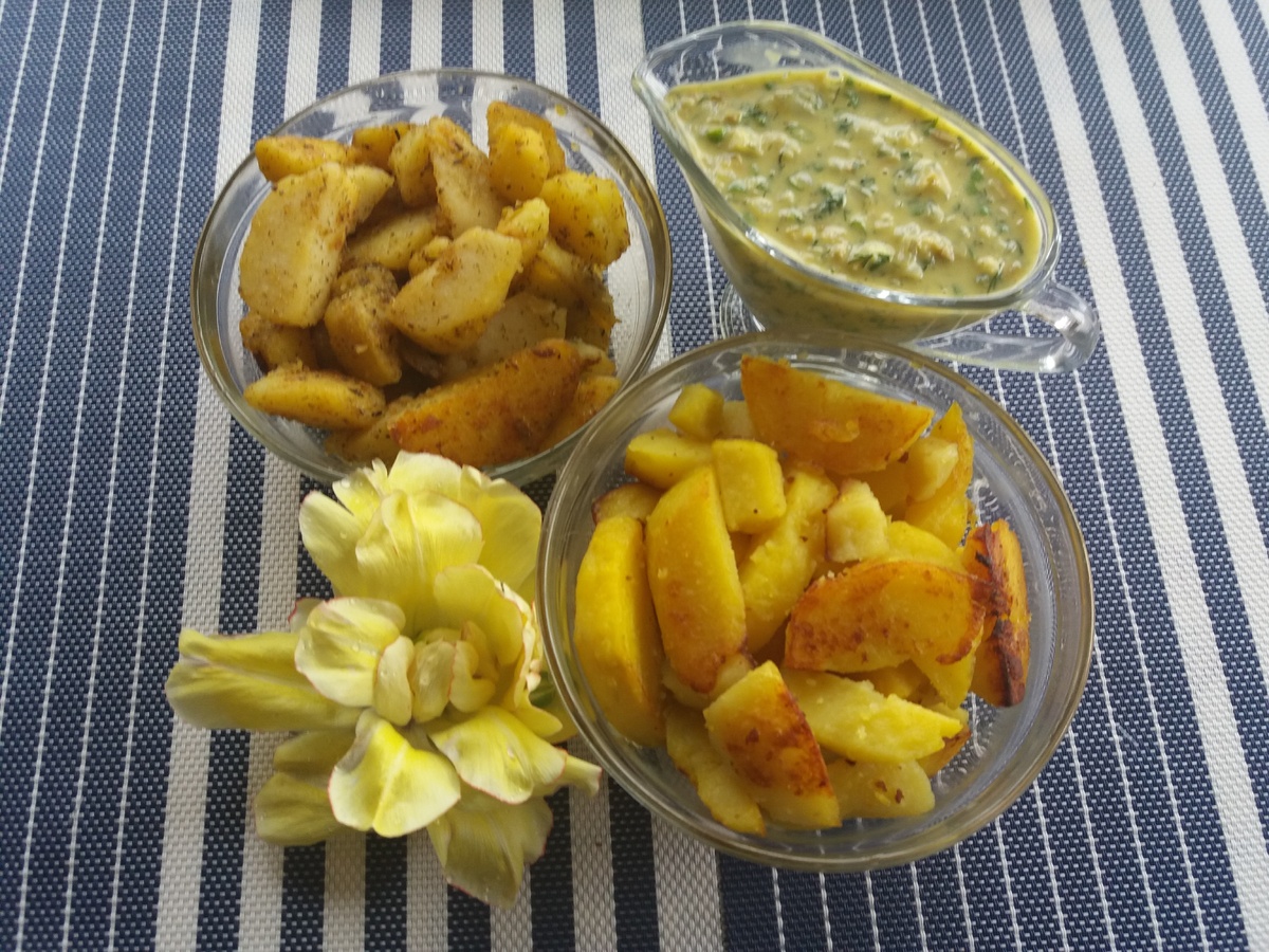 Соус ставится в холодильник, а картофель очищают и нарезают на крупные дольки. Начинается процесс жарки: первый заход осуществляется с приправами, второй — только с солью. Когда картофель подрумянится, его можно подавать. Завершает блюдо аппетитный соус и, для любителей остроты, домашняя аджика. Приятного аппетита!