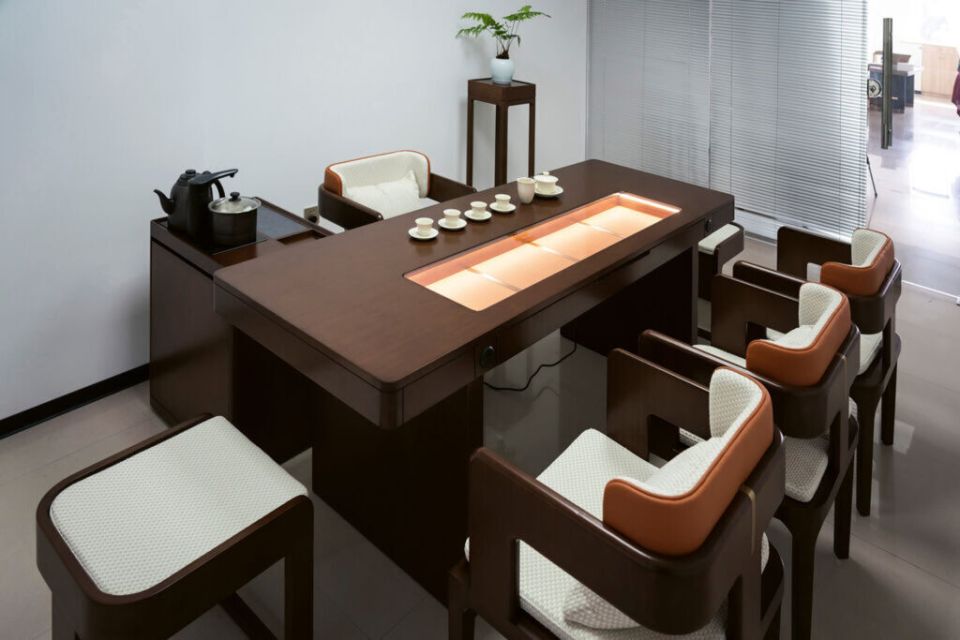Одним из ярких проектов является элегантный набор мебели для чайной комнаты. Это не просто набор столов и стульев, а целая концепция, призванная создать атмосферу уюта и гармонии. Мебель выполнена из темного дерева и включает в себя: