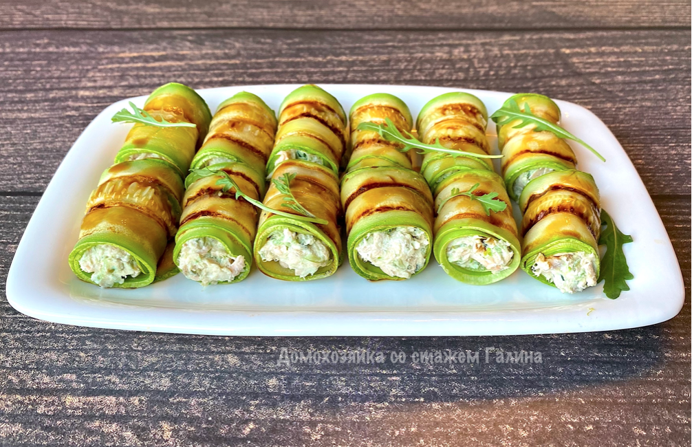 Для начинки нужно приготовить смесь из мелко нарезанного филе горбуши, салата Чука и творожного сыра. Рекомендуется добавить немного свежего укропа для аромата. После того как начинка готова, ее следует равномерно распределить по каждому ломтику кабачка и аккуратно свернуть в рулетик.