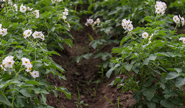 Окучивание картофеля следует начинать, когда высота кустов достигает 15-20 см, чаще всего это происходит в конце мая — начале июня. В этот момент рекомендуется засыпать землю по нижние листья, оставив верхушку на поверхности, так как засыпать картофель «с головой» крайне нежелательно.