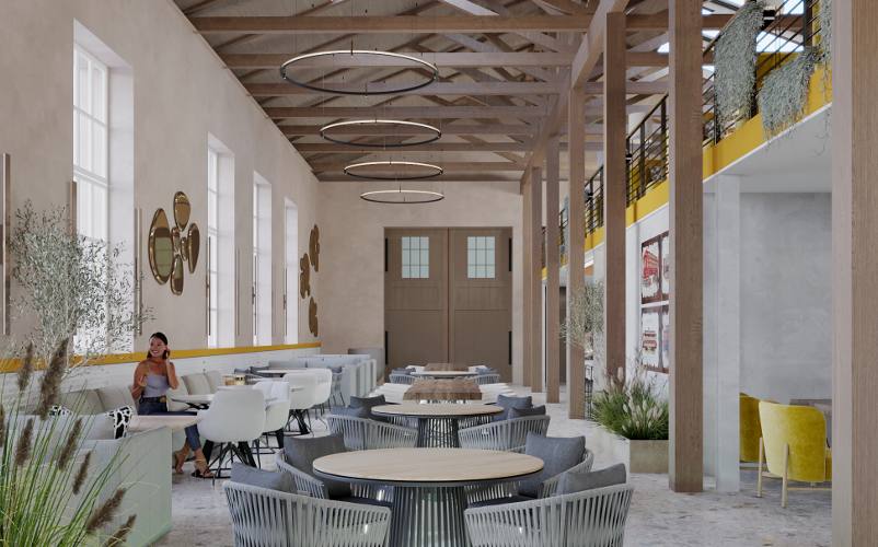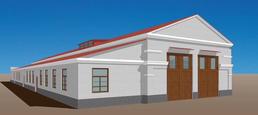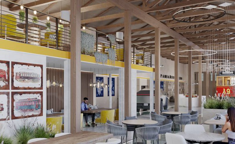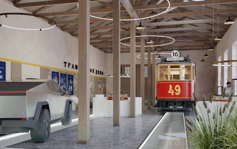 Бывшее депо в Адмиралтейской слободе хотят превратить в кафе после реставрации. На эскизах видно электромобиль-пикап Tesla Cybertruc и вагон трамвая.