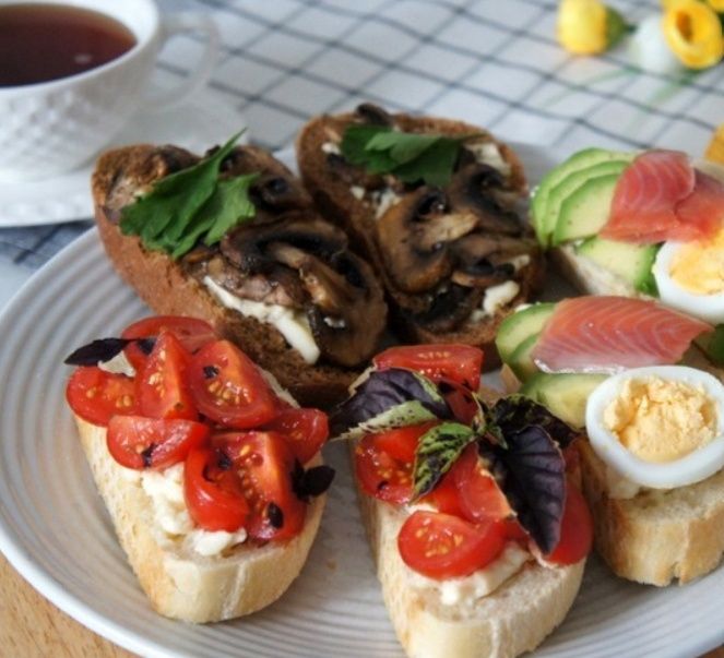На готовые хлебцы выложить начинку: на грибные — обжаренные шампиньоны, на сырные — помидорную смесь, а на сливочные — авокадо, яйца и рыбу. В итоге получается аппетитное ассорти, которое приятно удивит гостей и создаст атмосферу уюта.