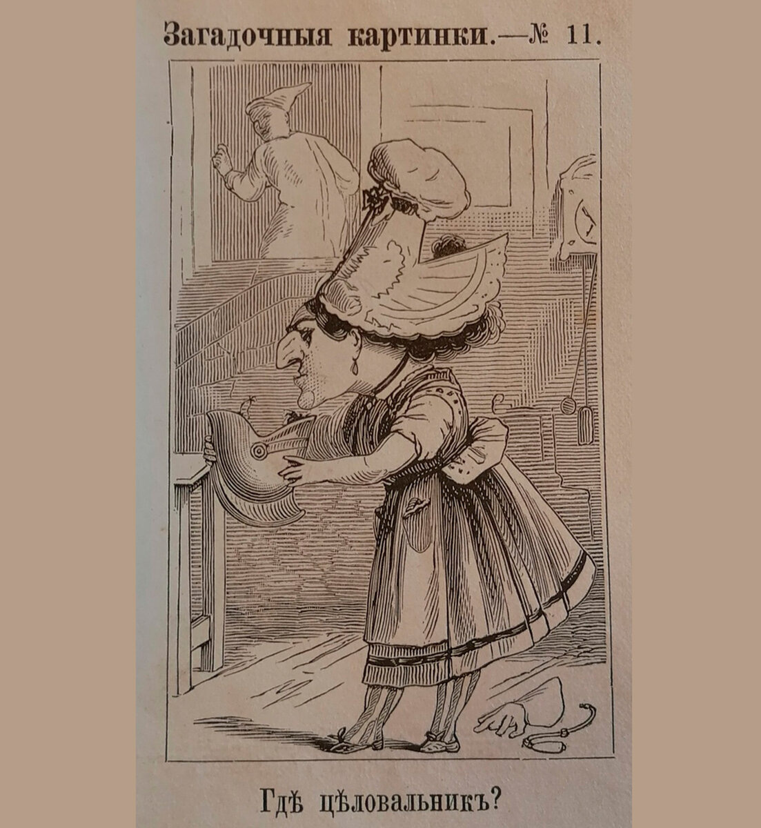 Эта загадка, опубликованная в "Петербургской газете" в 1913 году, стала настоящей жемчужиной. Рассматривается сцена из другой эпохи: пожилой джентльмен, лежащий в постели, и его кошка Душка, безмятежно устроившаяся рядом. Однако настоящая игра заключается в том, что жена господина скрыта где-то в комнате. Каждая деталь, от графики до дымки от трубки, создает атмосферу таинственности и требует от зрителя умения "читать" пространство.