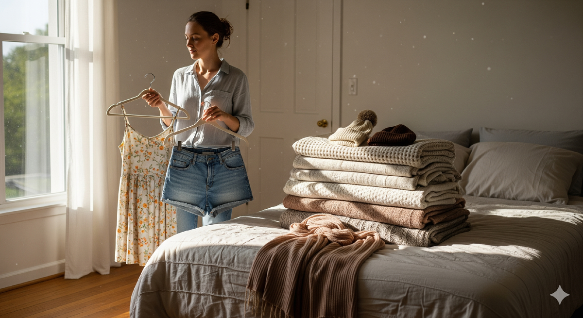- Обновление гардероба: Пора освободить место для теплых свитеров и шарфов! Летние вещи стоит аккуратно убрать, чтобы оставить пространство для осенних нарядов. Кроме того, стоит проверить обувь — почистить её и при необходимости отдать в ремонт.