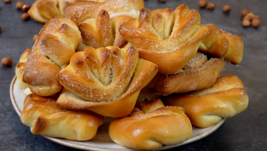 Когда тесто подойдет, его выкладывают на стол и делят на 18 равных частей. Каждая часть формируется в округлый колобок, раскатывается скалкой, смазывается маслом и посыпается сахаром. Складывание пополам и надрезание создадут уникальную форму, напоминающую лилию.