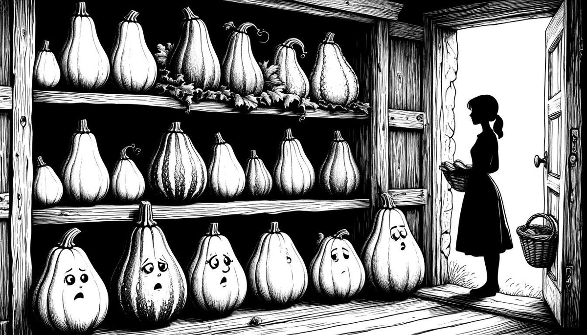 В погребе две кабачковые знаменитости ведут беседу о своих приключениях. Первый хвастается, что побывал у двух хозяев, второй — у трех. Тут к разговору присоединяется младший братец: