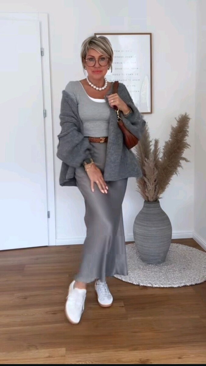 - Монохромный стиль: Серый ансамбль, включающий приталенную юбку-макси, глубокую футболку и кардиган без застежки. Контраст белых кроссовок придаст образу динамичности.