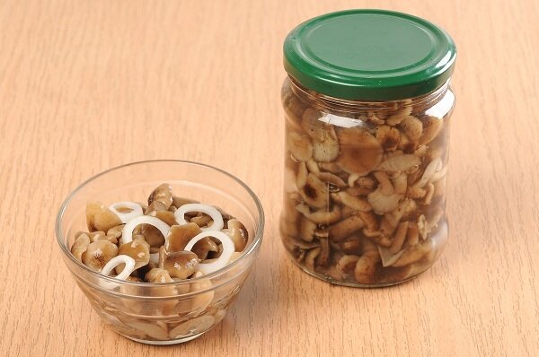 Готовые грибы необходимо отцеживать, а затем сразу же залить маринадом и варить еще 10 минут. Далее разложите опята по заранее стерилизованным банкам, плотно утрамбовывая их. Залейте сверху маринадом, накройте крышками и поместите в горячую воду на 25 минут для стерилизации. После этого банки нужно герметично закрутить и укрыть плотной тканью для остывания. Хранить такую закуску можно как в бережно закатанных банках, так и используя капроновые крышки в холодильнике.
