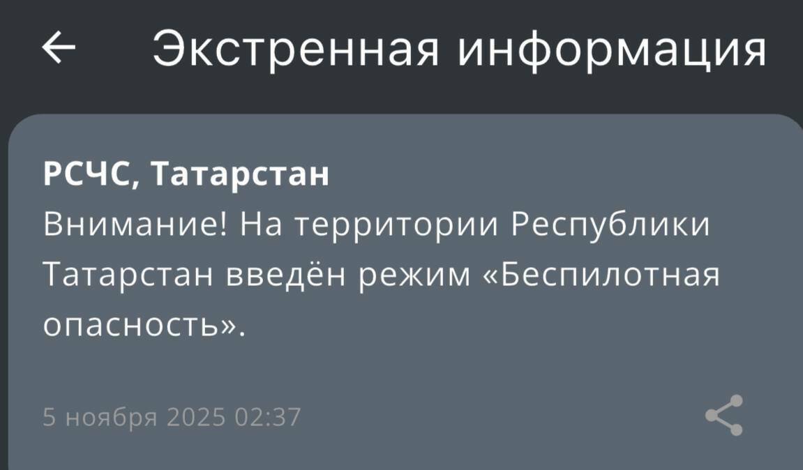 В Татарстане с 02:37 введён режим «Беспилотная опасность». Сообщение об этом опубликовано в официальном приложении МЧС России.