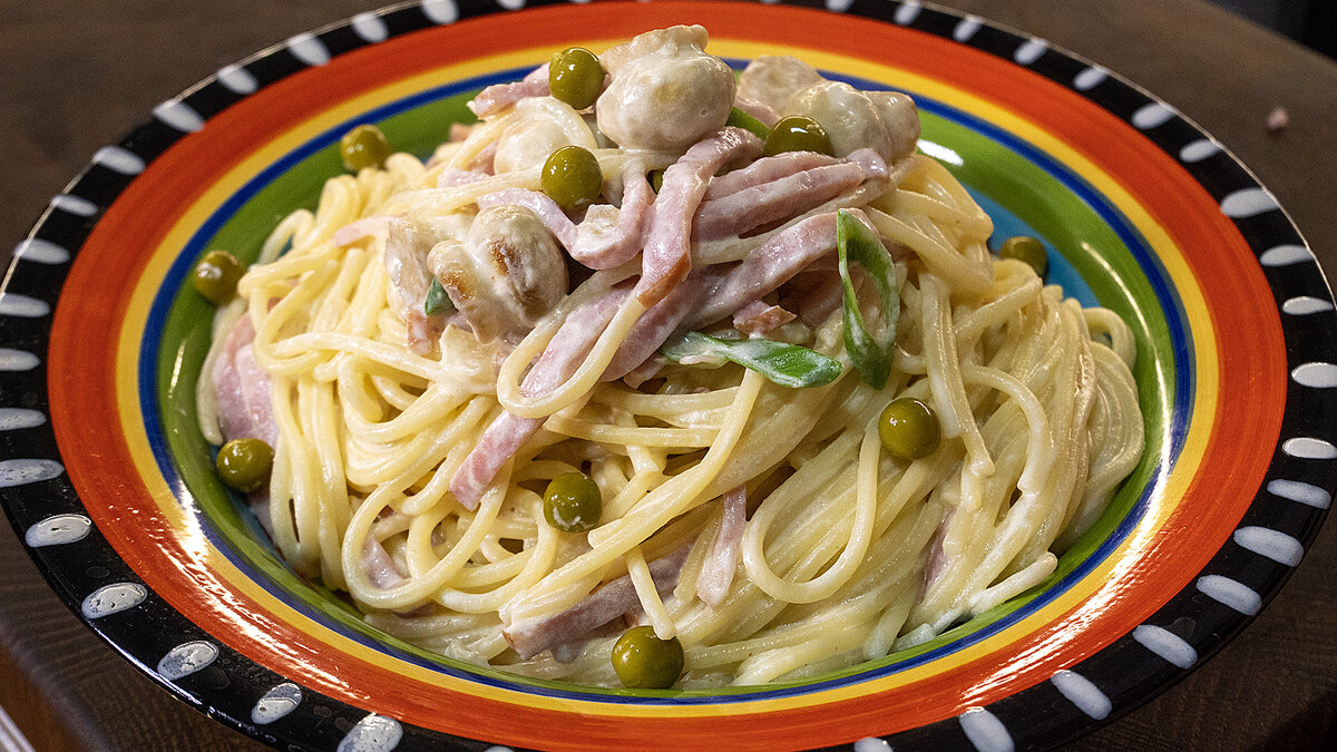 Далее нужно нарезать ветчину тонкими полосками и натереть твердый сыр на крупной терке. Ветчину отправляют на сковороду к луку и грибам, слегка прогревают вместе. Прибавляем сливки и вводим тертый сыр — вся масса должна стать однородной, но не переваренной. Как только сыр расплавится, пришло время добавить отваренные спагетти, а также консервированный горошек. Не забываем про соль и перец по вкусу, хорошо перемешиваем.