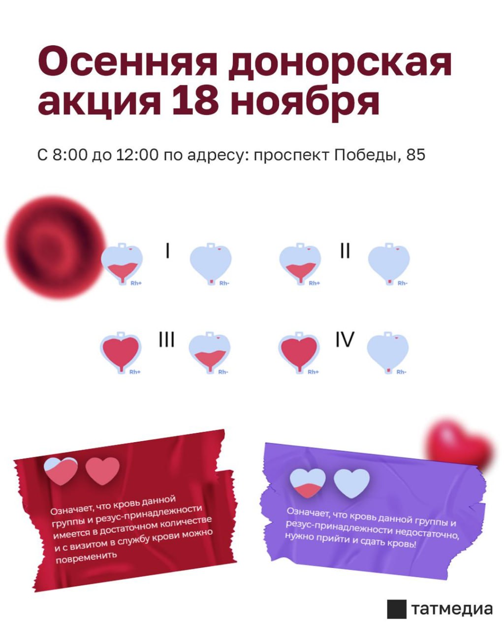 Кровь можно будет сдать 18 ноября с 8:00 до 12:00 по адресу: проспект Победы, 85. Необходимо иметь при себе паспорт и СНИЛС.