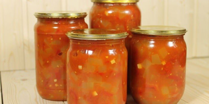 Помидоры моются и пропускаются через мясорубку, после чего полученная масса добавляется к овощам в сковороду. Все вместе нужно варить 10 минут, затем добавляются уксус, соль и сахар. Размешав, доведите до кипения и готовьте еще 5 минут. После приготовления перелейте салат в подготовленные банки для хранения.