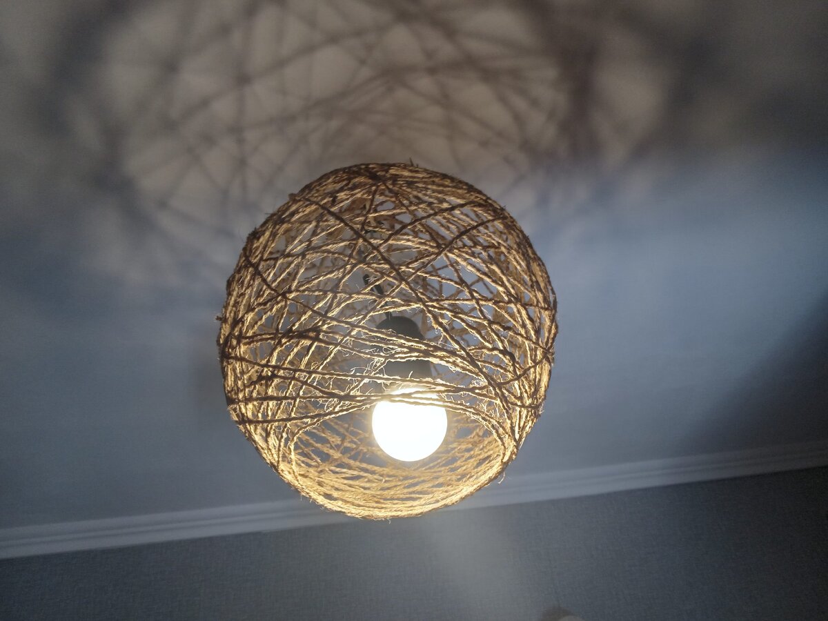 После полного высыхания, который обычно длится ночь, нужно аккуратно освободить абажур от шарика, медленно прокалывая его иглой, чтобы он сдулся. В результате получится стильный джутовый абажур, который станет отличным акцентом в интерьере.