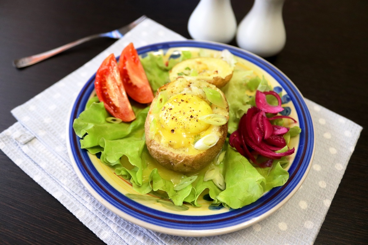 Полученной начинкой наполняются картофельные оболочки, оставляя немного места для яйца. На завершающем этапе аккуратно вбивается яйцо в каждую картофелину.