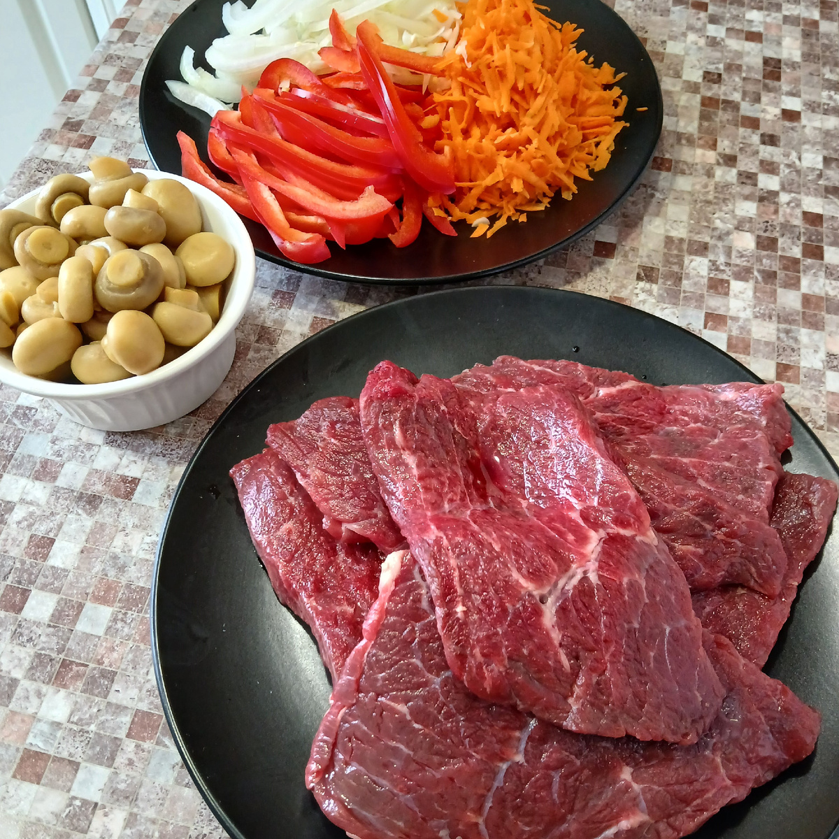 1. Подготовка мяса: Говядину нарезать на порционные куски и хорошо отбить. Приправить солью и перцем, чтобы мясо впитало ароматы специй.