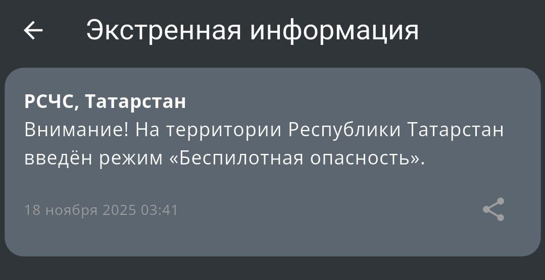 В Татарстане с 03:41 введён режим беспилотной опасности. Об этом сообщили в мобильном приложении МЧС России.