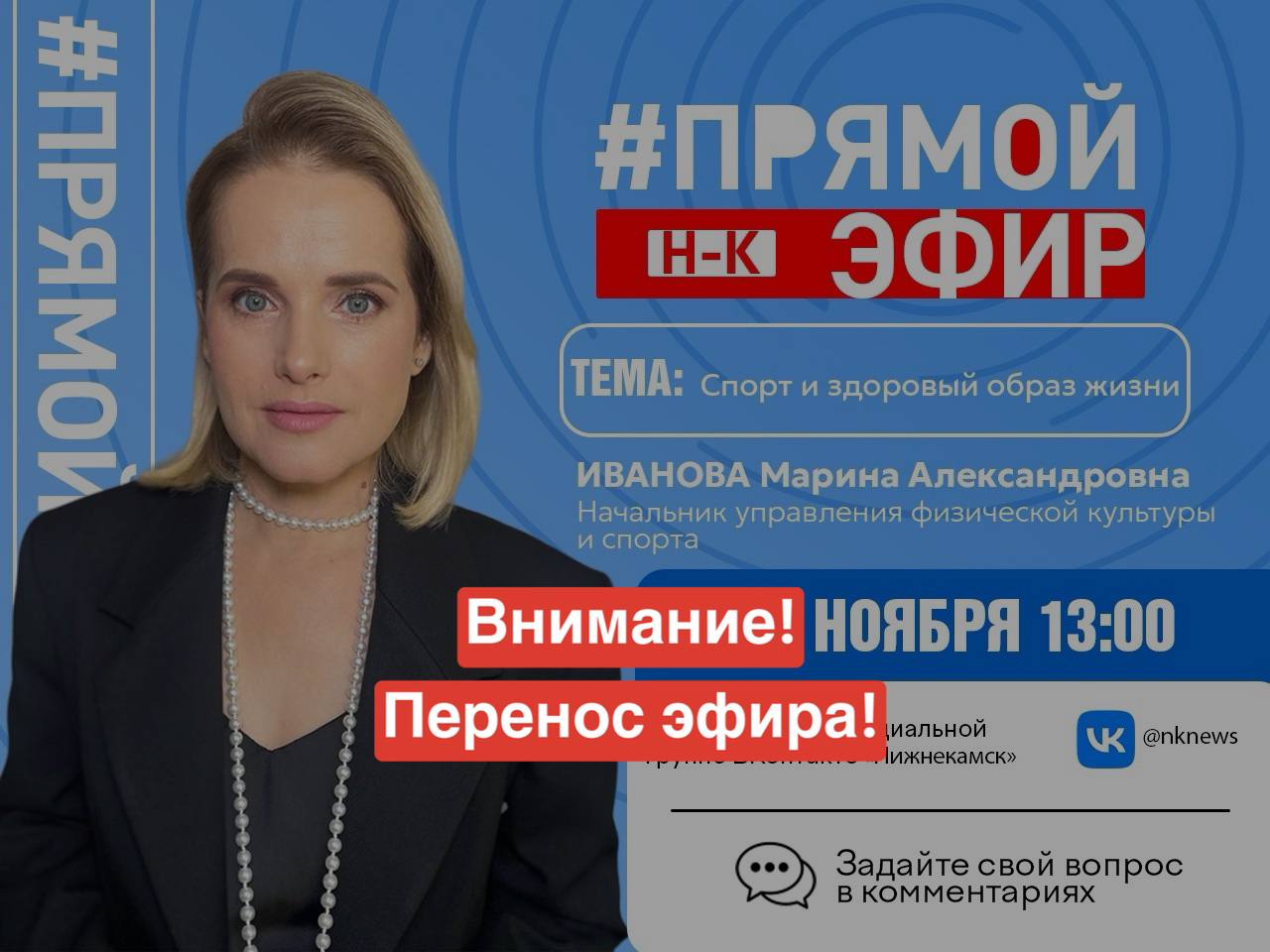 ВниманиеВ связи с техническими причинами эфир с Мариной Ивановой, начальником управления физической культуры и спорта НМР РТ, запланированный на сегодня, отменяется