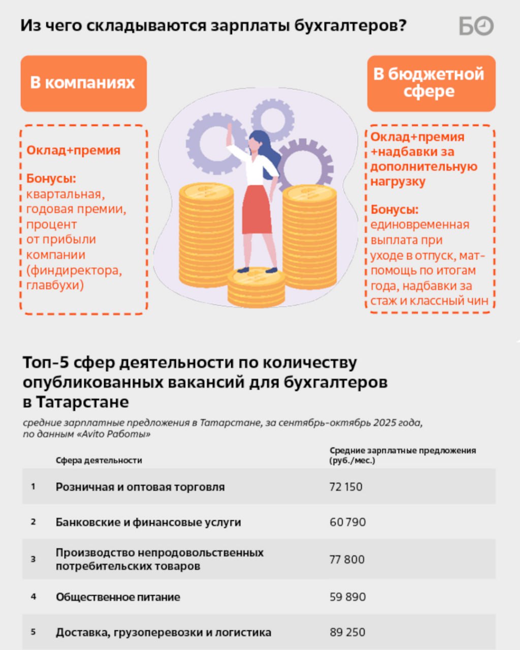 Заработок зависит от масштаба компании, специализации и формата занятости. Финансовые директора и главбухи крупных предприятий получают оклад, премию и бонус в виде процента от прибыли, их медианная зарплата составляет 250 и 165 тысяч рублей в месяц соответственно, а максимальная может достигать 800 и 370 тысяч рублей. В среднем звене зарплаты бухгалтеров по «участкам» начинаются со скромных 50 тыс. рублей и доходят до 90 тыс. рублей, при этом самый высокооплачиваемый и дефицитный специалист — бухгалтер по зарплате. В бюджетной сфере зарплата бухгалтера колеблется на уровне 50-80 тысяч рублей и редко доходит до 100 тысяч, тогда как бухгалтер-аутсорсер, ведущий несколько небольших компаний, может получать от 15 до 45 тысяч рублей с каждого клиента.