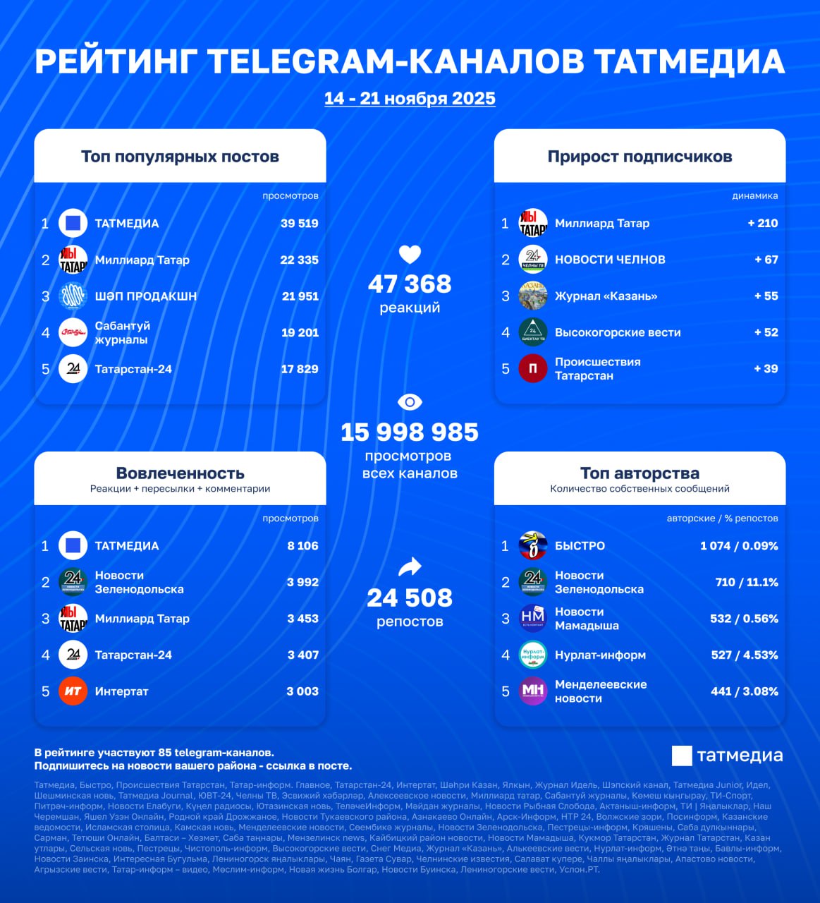 Новый еженедельный рейтинг tg-каналов Татмедиа | 14 - 21 ноября