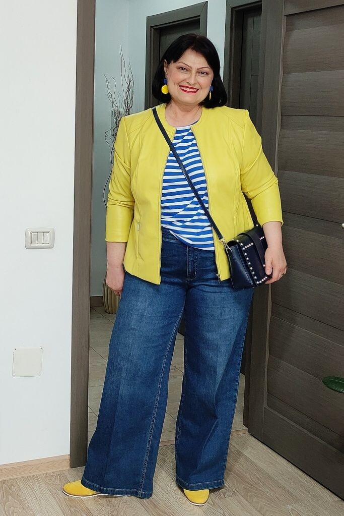 - Шире, но не громоздко: Широкие тёмно-синие джинсы будут уместны в любых обстоятельствах. Они не только скрывают недостатки фигуры, но и отлично сочетаются с «тельняшкой» с коротким рукавом в сочетании с ярко-жёлтой курткой. Обувь может быть столь же яркой, как и верхняя одежда, а завершить образ стоит стильной сумочкой и выразительными серьгами.