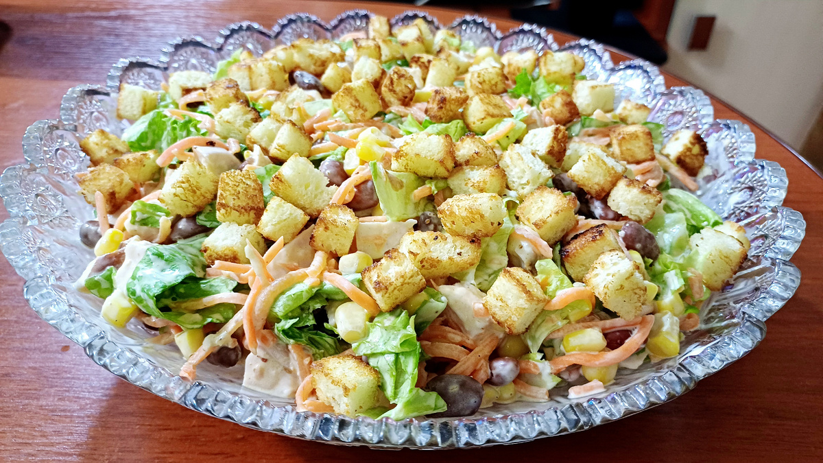 В завершение, аккуратно посыпьте сверху охлаждённые и хрустящие сухарики, которые добавят особую текстуру. Раскройте для гостей этот аппетитный салат и наблюдайте, как они наслаждаются каждым кусочком!
