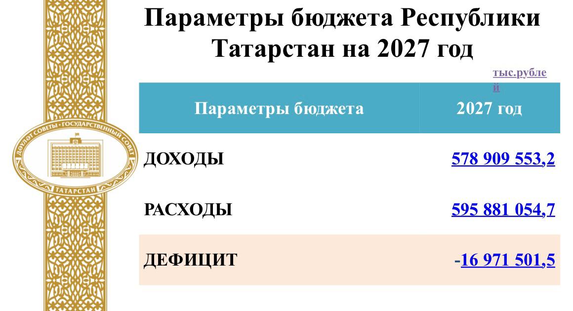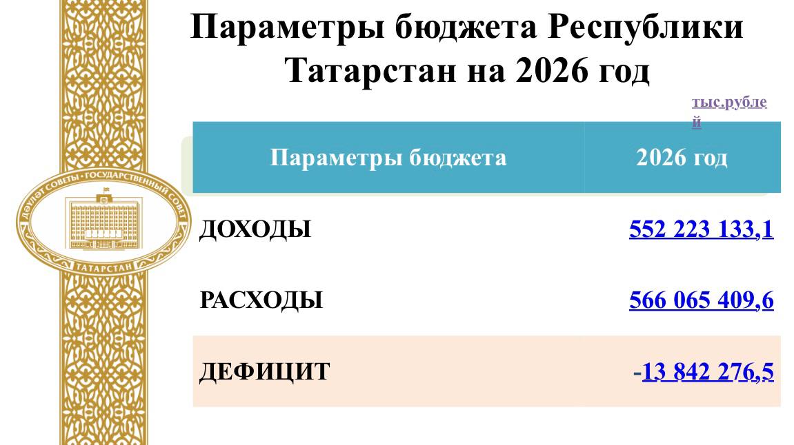 В результате предлагаемых поправок общий объем доходов бюджета республики на 2026 год составит более 552,2 млрд рублей, объем расходов - 566 млрд рублей, дефицит бюджета – 13,8 млрд рублей.