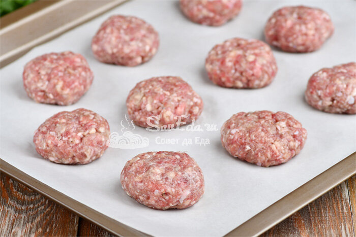 На противне, предварительно выстланном пергаментом, сформируйте 10 небольших лепешек и накройте их еще одним листом бумаги. Используя стакан, придайте фаршу форму и слегка прижмите. Выпекайте в духовке при 200°C около 15 минут, сняв верхний слой пергамента в конце для получения румяной корочки.
