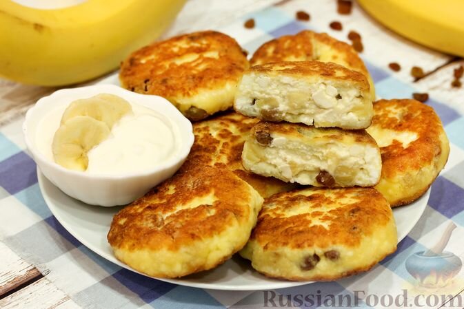 - Сырники с бананом и изюмом — сочетание сладких бананов и мягкого изюма придаст сырникам яркий вкус. Использование кукурузной муки сделает текстуру более воздушной и легкой. Идеальная подача — со сметаной, которая отлично сбалансирует сладость.