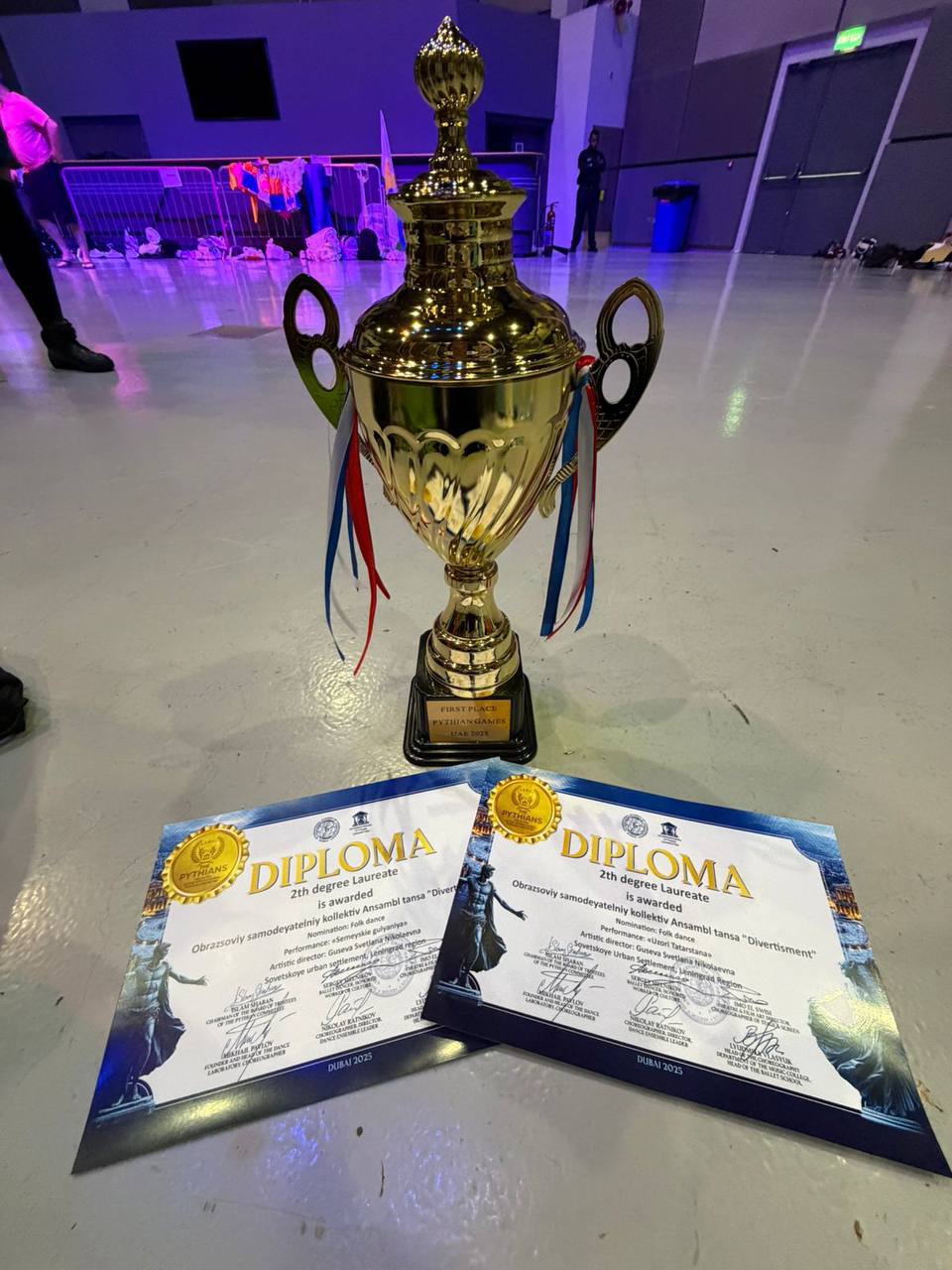 Ансамбль танца «Дивертисмент» из Выборгского района Ленинградской области завоевал звание лауреата I степени на престижных международных соревнованиях – Первых Всемирных Пифийских играх в Дубае. Ансамбль одержал победу в двух номинациях с номерами «Узоры Татарстана» и«Семейные гуляния».