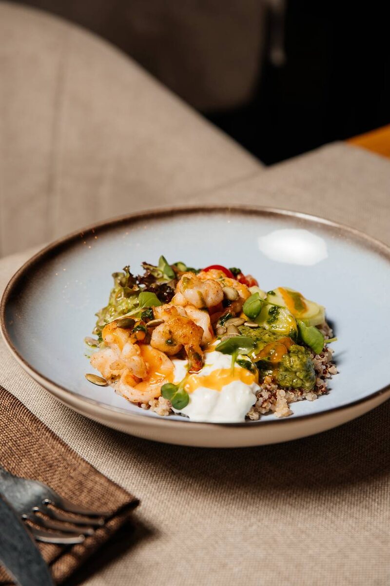 Сочетание насыщенных вкусов и свежих ингредиентов делает этот салат настоящим кулинарным произведением. В нем идеально переплетаются сладость жареных креветок, питательность киноа и кремовая текстура гуакамоле, дополненная освежающим соусом дзадзыки. Это чудесное угощение идеально подходит как для легкого обеда, так и для праздничного стола.