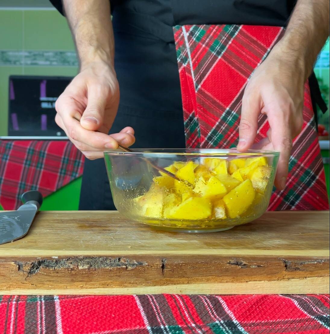 Первым делом необходимо отварить или запечь картофель в мундире. После остывания его стоит нарезать кубиками. В процессе приготовления заправки стоит смешать зернистую горчицу, мед, желток и рассол от огурцов, получив легкий и пикантный соус.