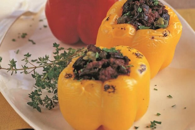 8. Наполнить перцы начинкой и выставить их в подготовленную форму. Посыпать оставшимися сухарями и сбрызнуть оливковым маслом.